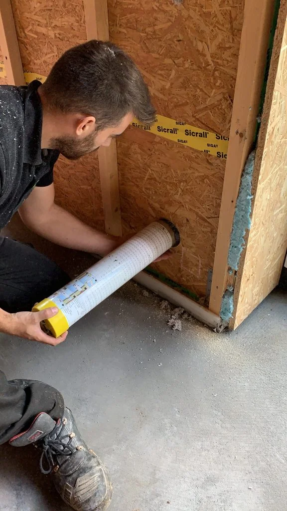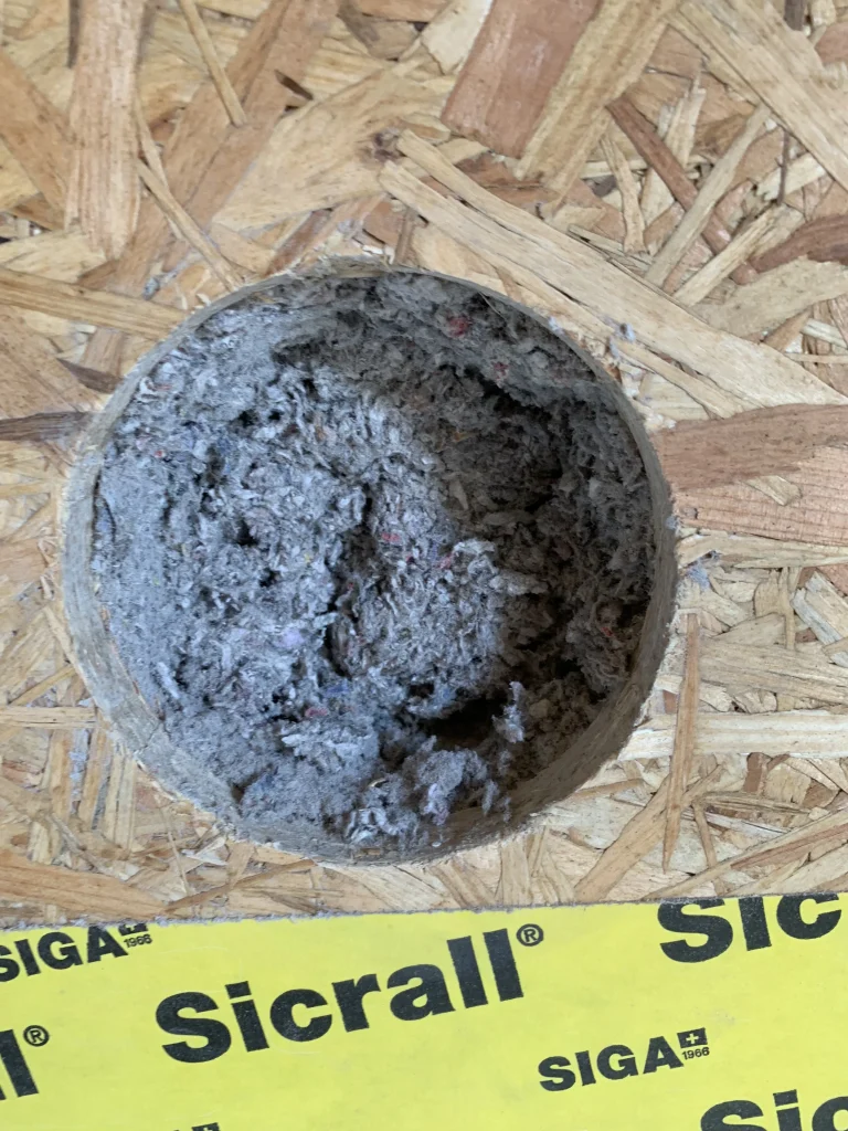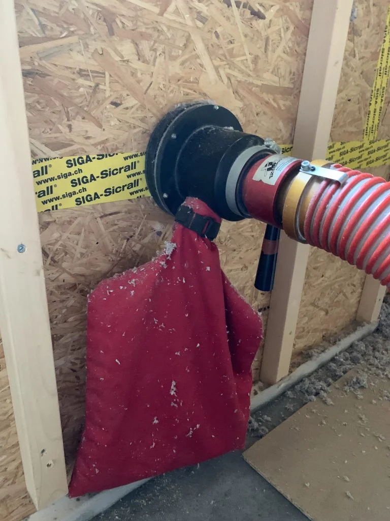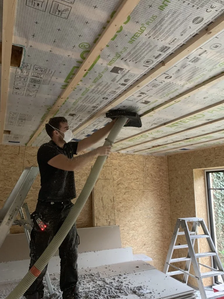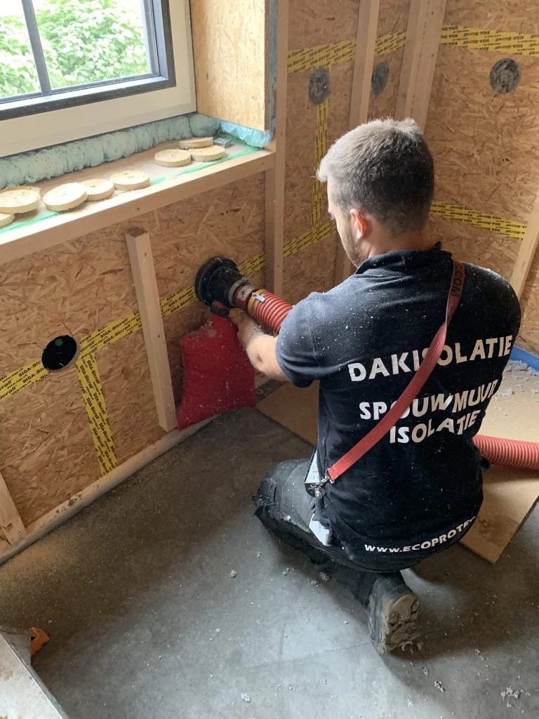 Inblazen van de isolatie tot het luchtdicht afwerken van de openingen en het netjes opruimen van de werf.